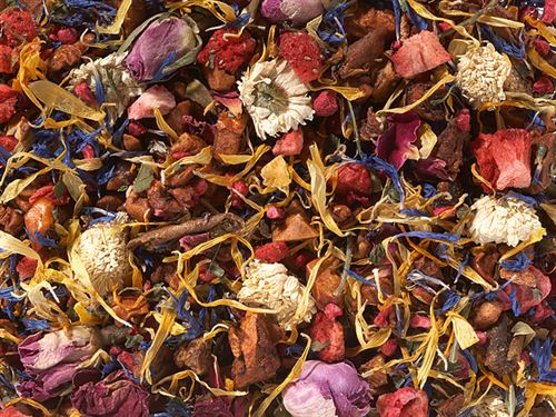 Ingrediënten: zure appelstukken, stukjes peer, rozenknopjes, gevriesdroogde aardbeistukken, gevriesdroogde frambozenstukken, aroma, braambesbladeren, korenbloemblaadjes, goudsbloembloesem, roos, Romeinse kamille.