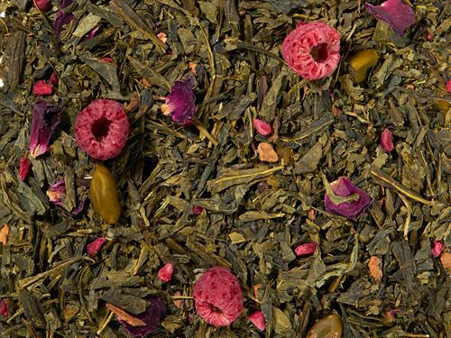 Ingrediënten: groene thee, aroma, pistache nootjes, kaneelstukjes, gevriesdroogde frambozen en roos.