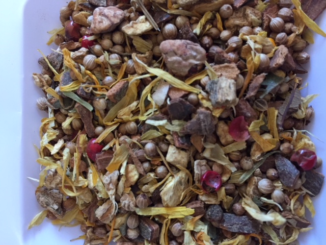 Ingrediënten: koriander, kaneel, gember, nootmuskaat, zoet bramenblad, zonnebloembloesem, rosa peper.