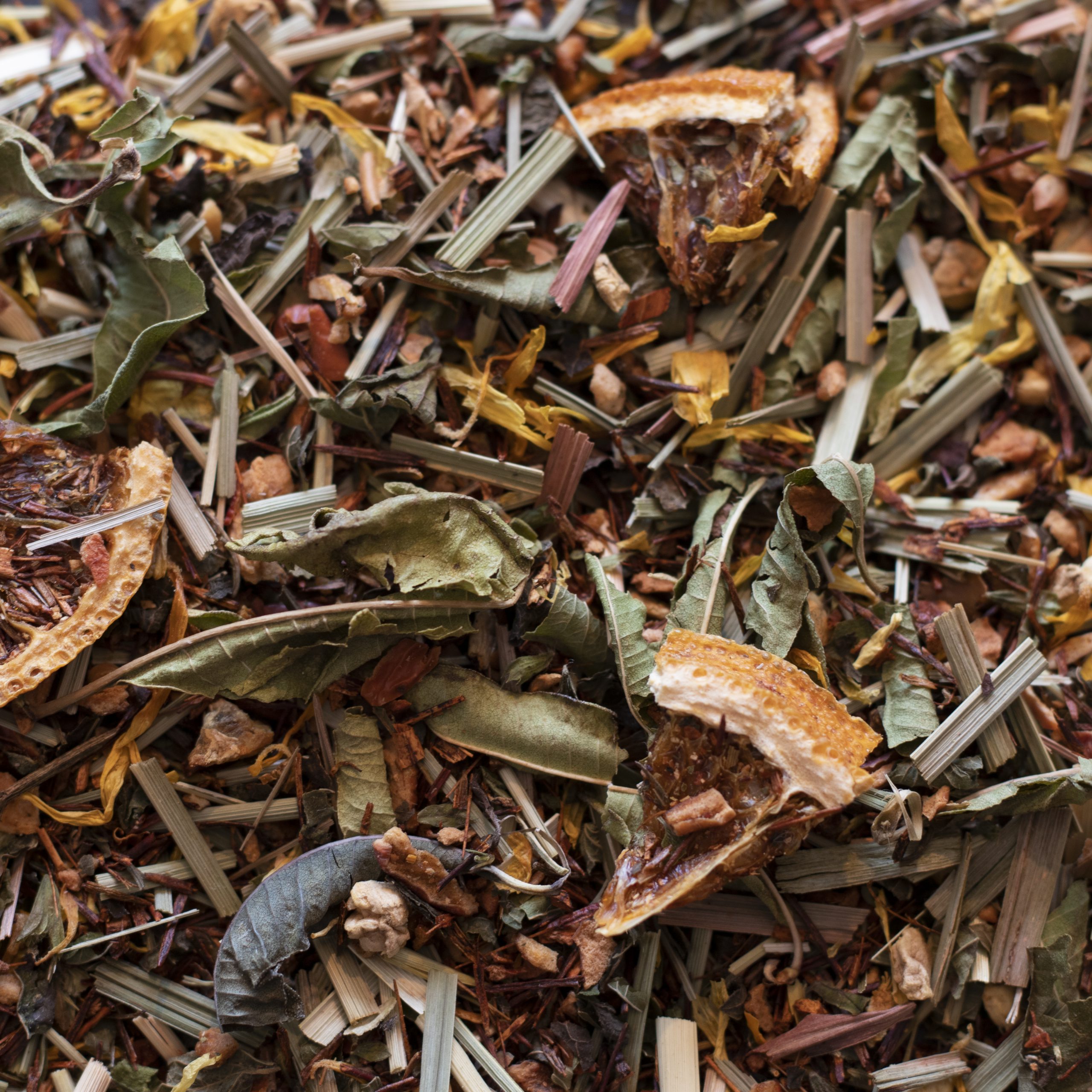 Ingrediënten: appel, rooibos, citroengras, gemberwortel, citroenmelisseblaadjes, aroma, sinaasappelschil, verbenabladeren, hennepzaden, goudsbloembloemen.