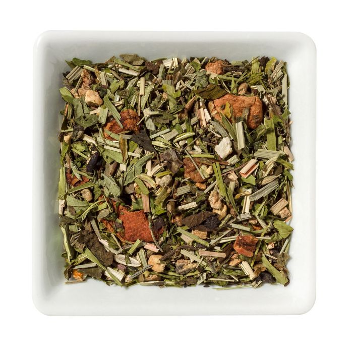 Ingrediënten: Venkel, stukjes appel, citroengras, gember, sinaasappelschil, citroenmelisse, gerstegras, zoete bramenblaadjes, hibiscuswit, hennepzaad, citrusolie, kruidenolie, limoenkorrels.