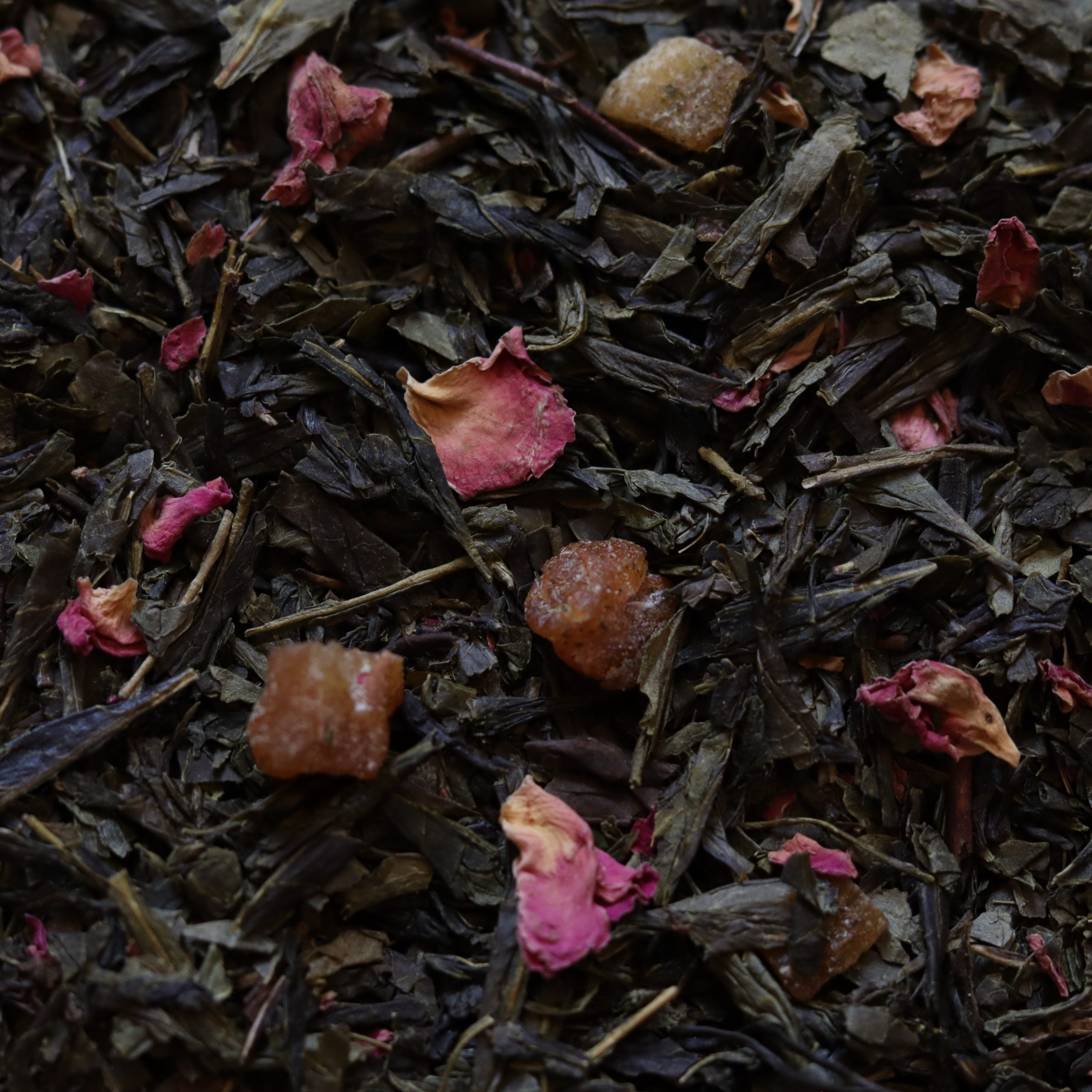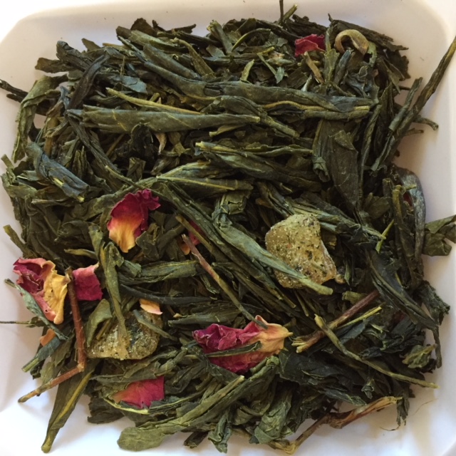 Ingrediënten: groene thee, stukjes peer en rode rozenblaadjes.