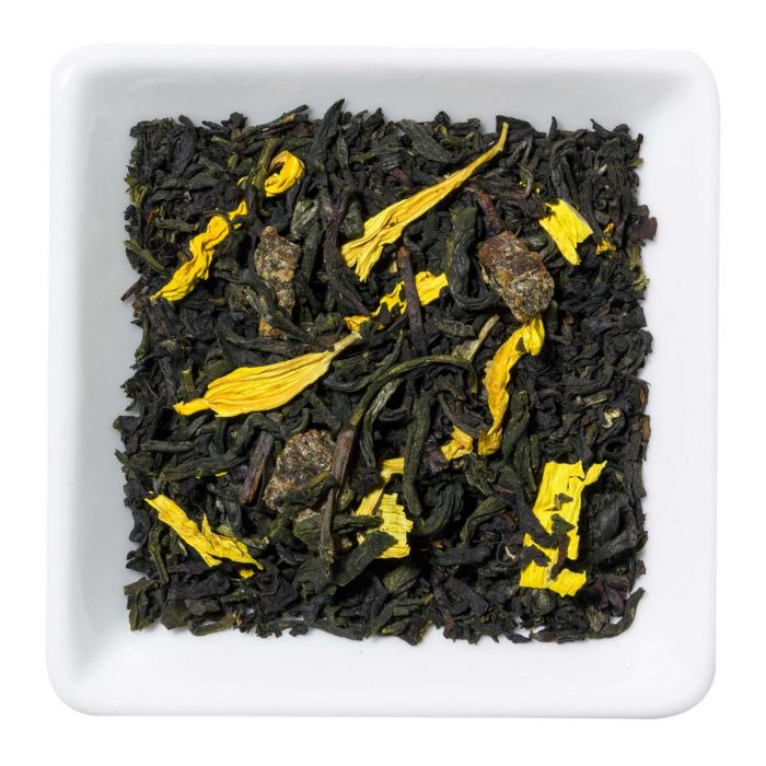 Ingrediënten: zwarte thee, witte thee, perzik stukjes met rijstebloem, zonnebloembloemblaadjes.