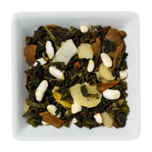 Ingrediënten: Thee (64%), kaneel (12%), kokos chips, geschaafde amandelen (6%), gepofte rijst, zoete zwarte bessenblad en aroma.