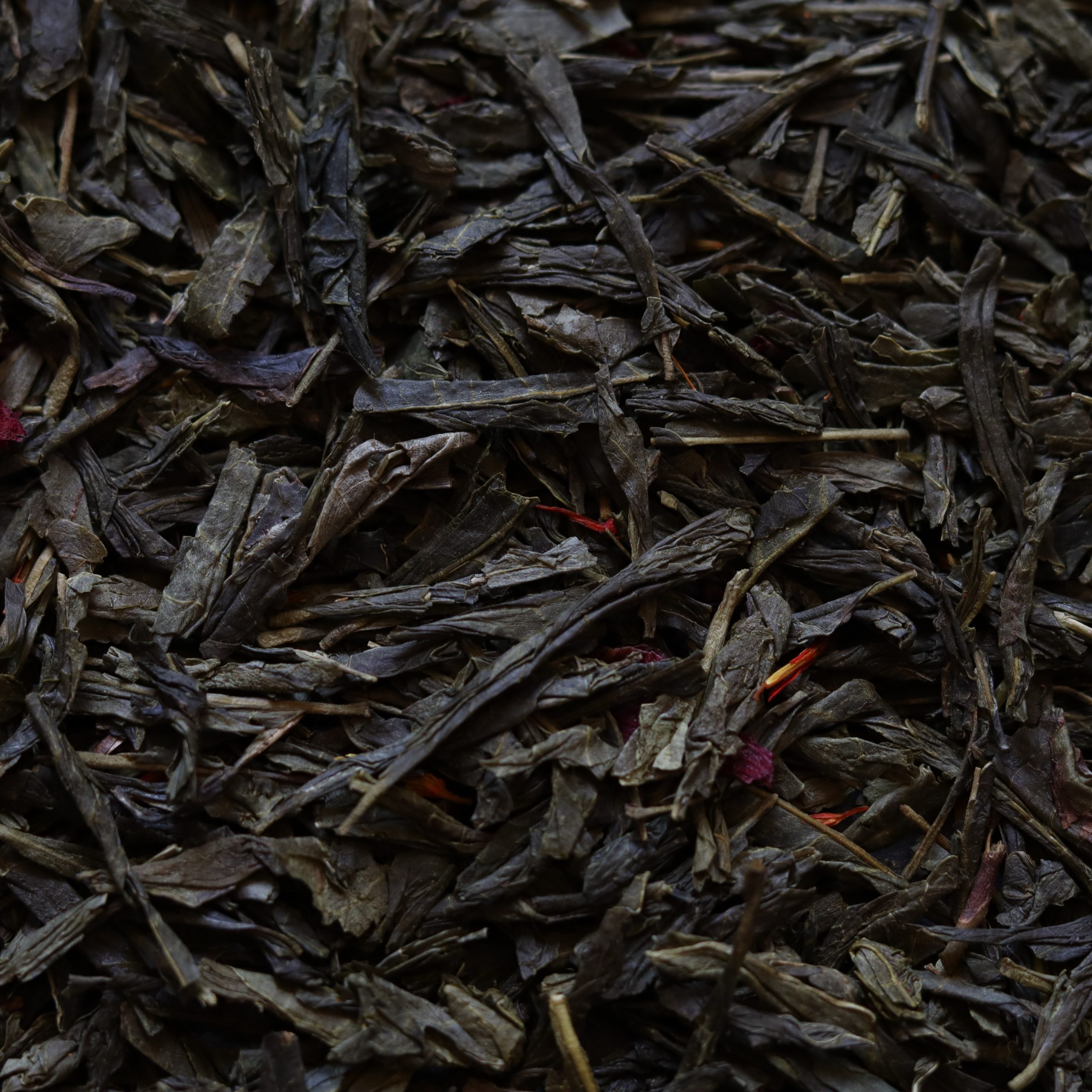 Ingrediënten: groene thee, pioenroosblaadjes, saffloerbloesem en stukjes gevriesdroogde aardbei.