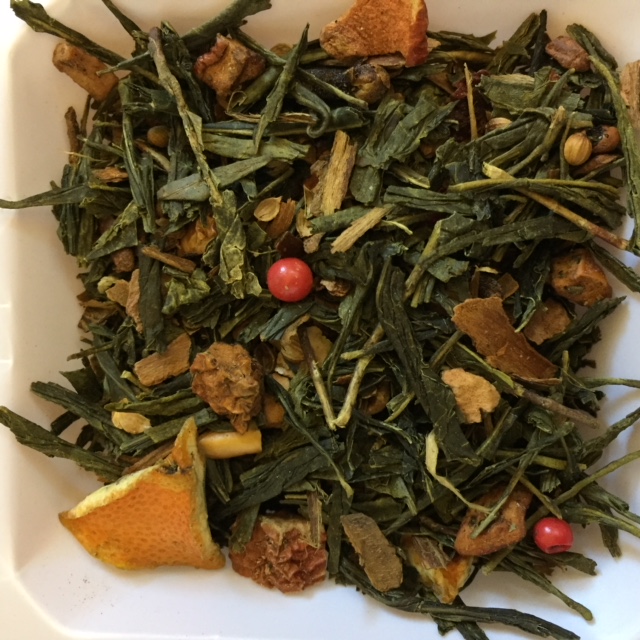Ingrediënten: groene thee, appelstukjes, kaneelstukjes, koriander, sinaasappelschijfjes, kardemom, roze peperbolletjes, kruidnagel
